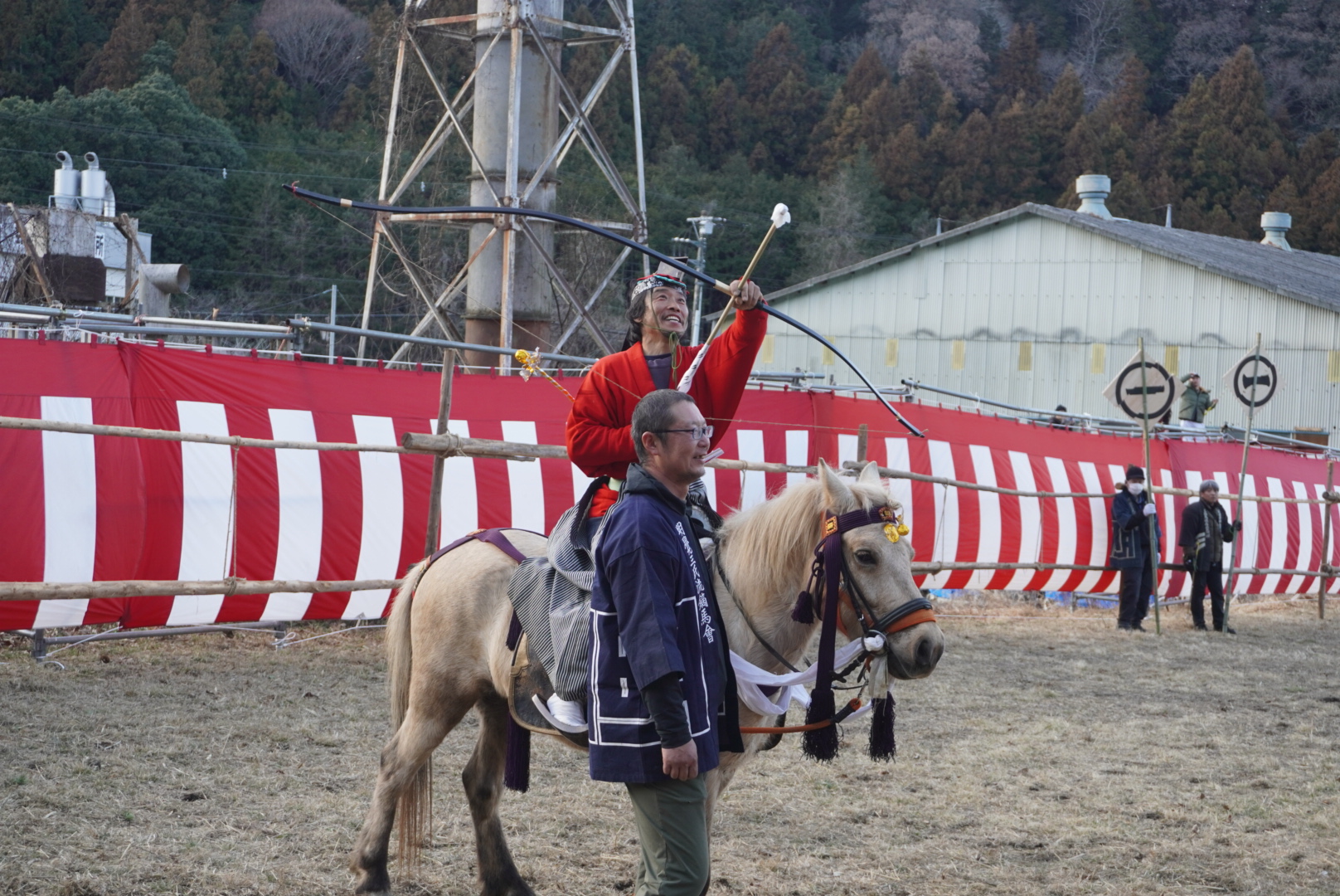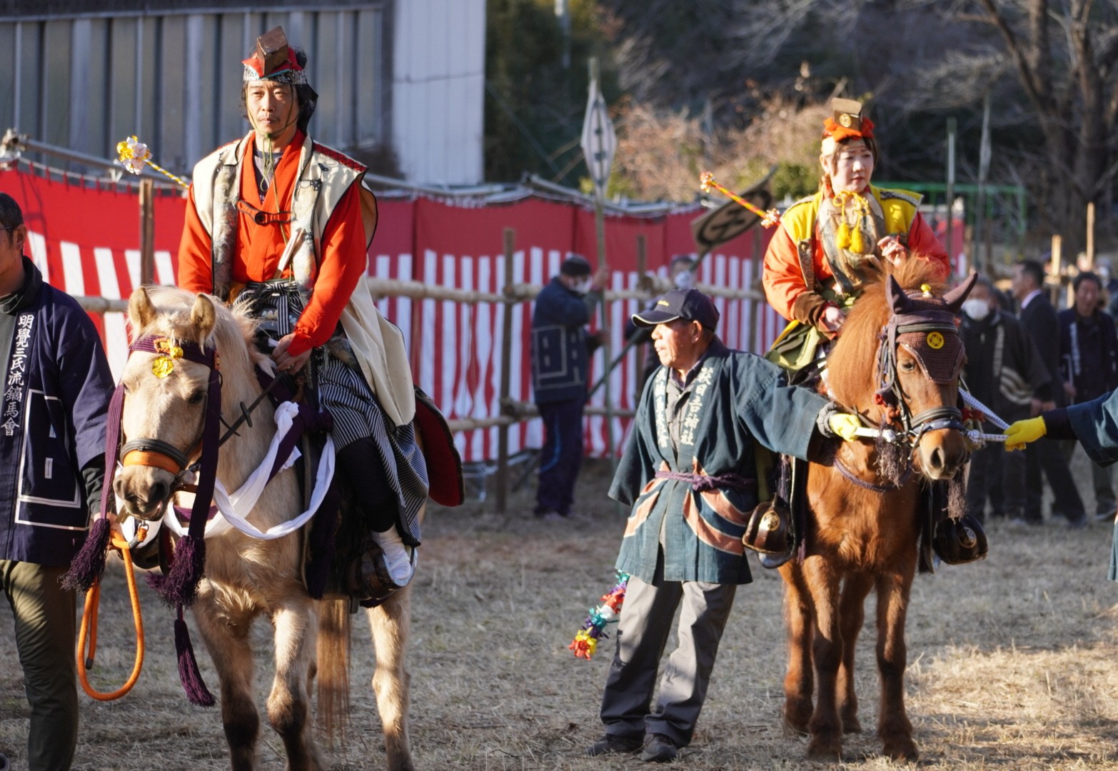 「萩日吉神社のやぶさめ」は、ときがわ町西平地内の萩日吉神社において、鎌倉時代の木曽義仲の家臣と伝えられる明覚郷(ときがわ町)市川・荻窪・馬場氏の3氏と大河郷(小川町)伊藤・加藤・小林・横川氏の4氏が主君である義仲の霊や祖先を供養するために流鏑馬を奉納したのが始まりと伝えられています。現在では、3年に一度、行われており、令和8年1月18日(日曜日)に実施されました。