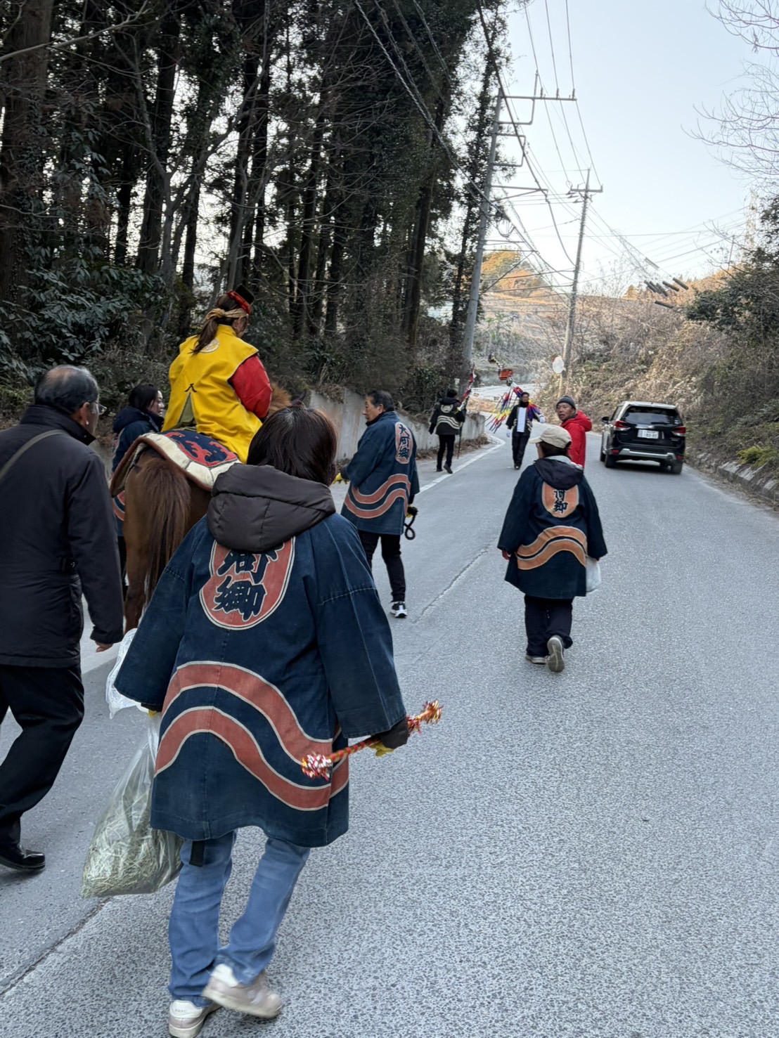 当番の「いざ出陣」とともに「おー」という掛け声で出陣します。途中、当番家の氏神様、四苗の氏神様、矢岸のオイセの氏神様、腰越の熊野神社、腰越のゴリョウ様、山王様、荒神様、天神様、宮寺の氷川様、宮下の天王様、松郷峠の神様等に四方固め、蟇目の神事を行います。