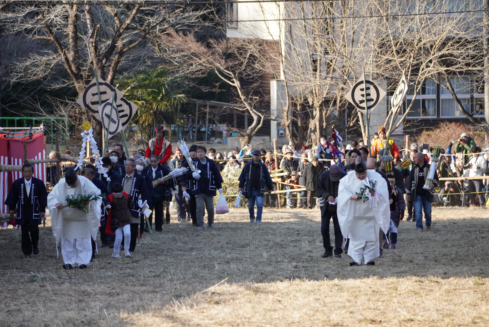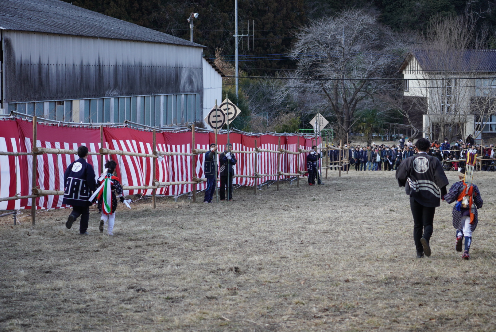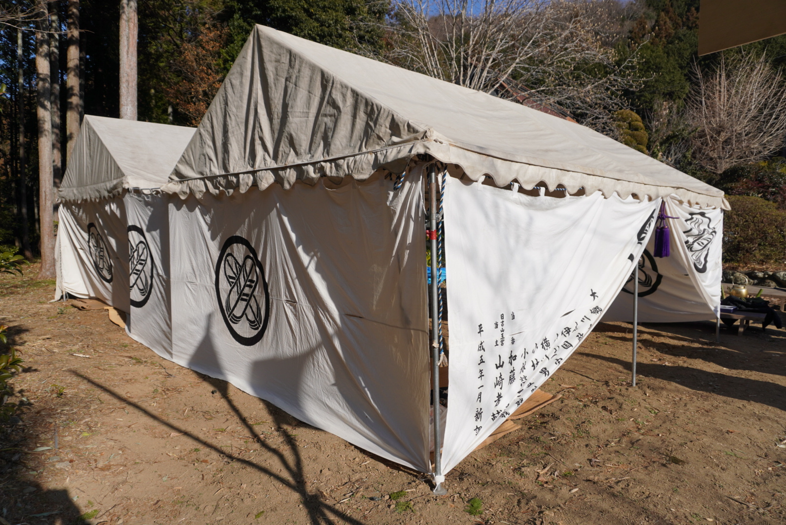 大河郷、明覚郷とも女人堂の参拝が終わると萩日吉神社の神官宅前の平場に対面する形で各苗の紋所のついた白い幕を張り巡らし、陣場を設営します。両郷の陣場が設営完了すると神官が安全祈願を行い、関係者一同にお祓いを行います。大河郷の陣幕には名乗りを上げた当番の武士の名が書かれています。