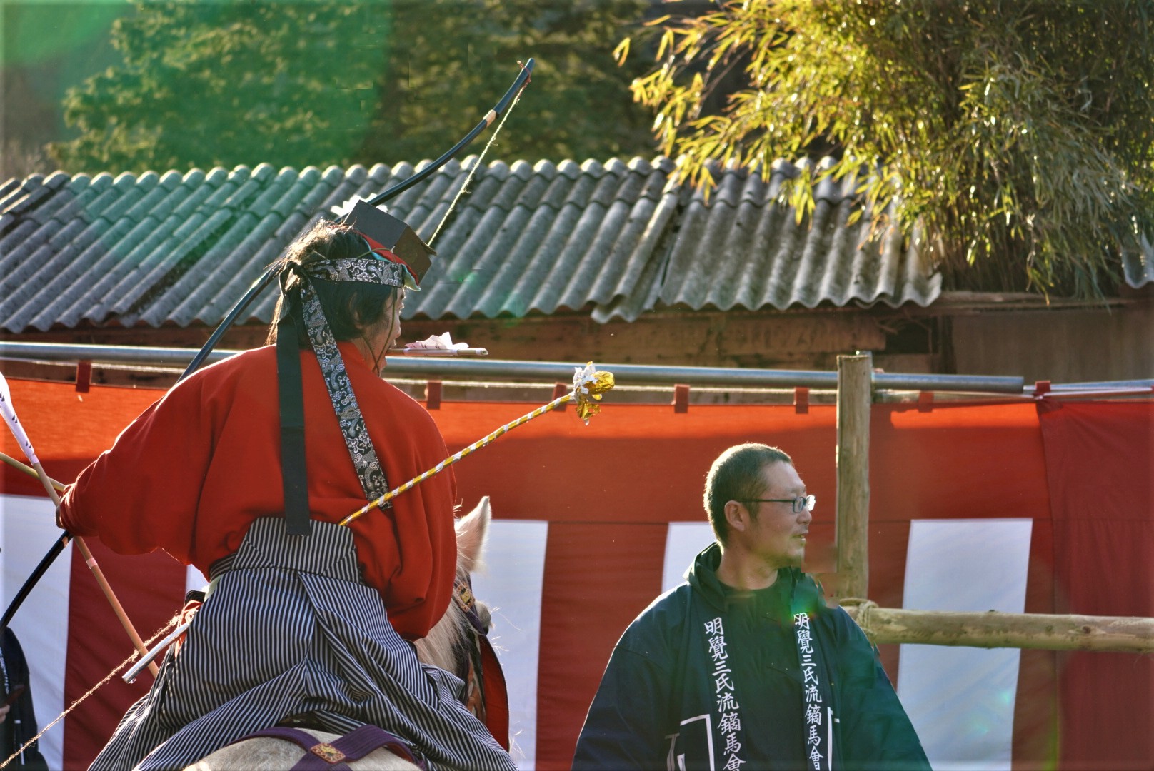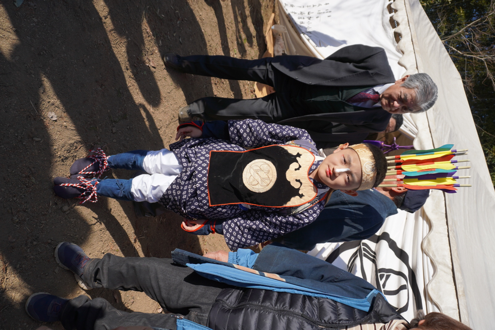介添え人とともに馬が走る前後に馬場を行ったり来たりします。背中に背負っている飾り矢の本数は7本と決められており、七苗の数と符合します。