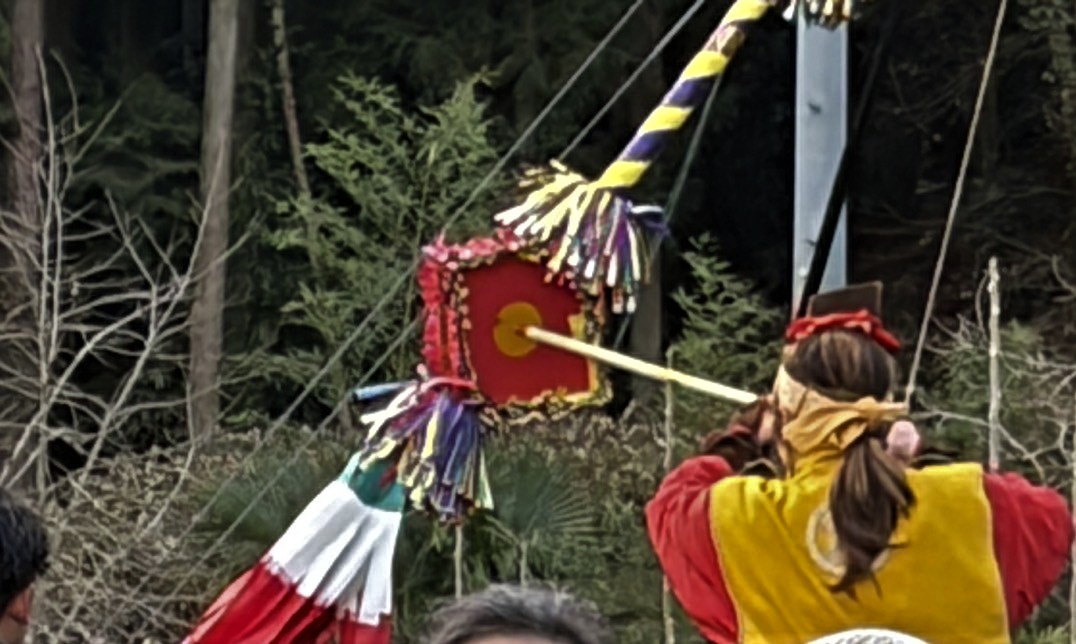 馬上の乗り子が一礼し、金の矢で神の的にコツコツと三度当て一礼します。