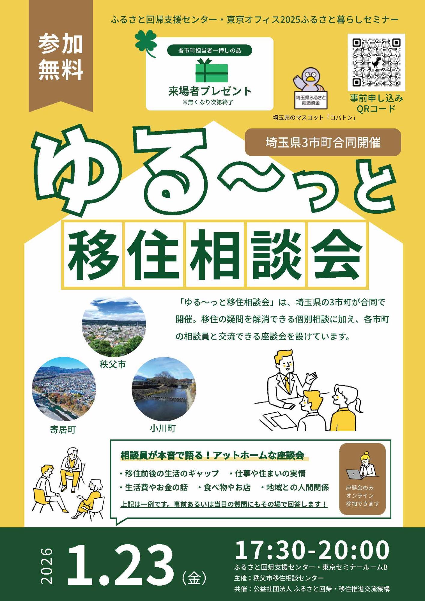 埼玉県の小川町・秩父市・寄居町の3市町が合同で移住相談会を開催します。