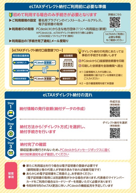 - ダイレクト納付(事前に登録した金融機関口座を指定して、直接税金を納付する方法)ができます。