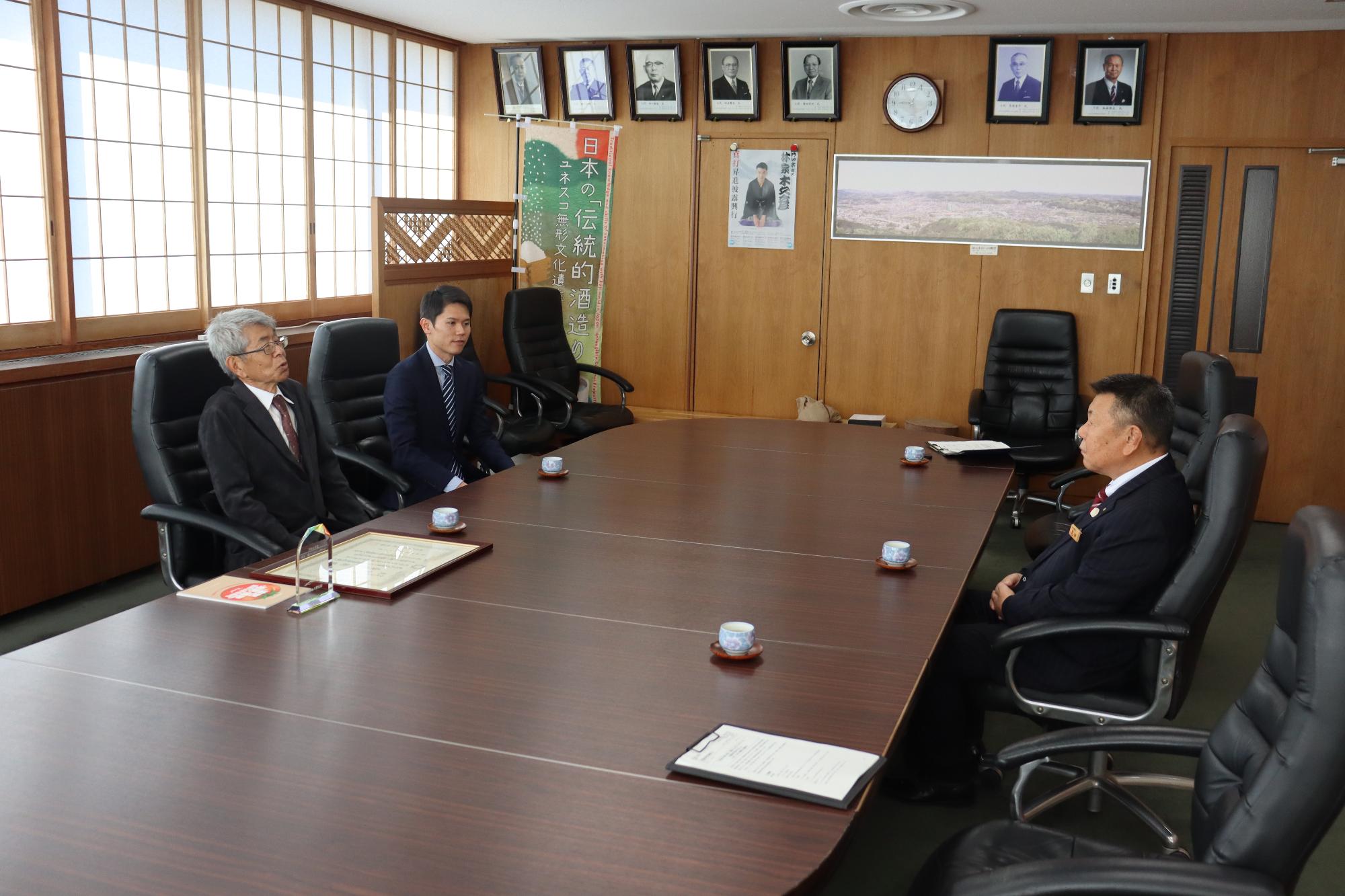 食品残さなどを有効活用したバイオガス技術により、バイオガス消化液肥と緑肥・堆肥を利用し、化学肥料を使用しない循環型の有機農業を実践しておられる桑原衛様に、3月13日、県知事から「埼玉・農のエコロジーアワード」の大賞が贈られました。受賞報告のため桑原様と、一緒に活動している竹田様が島田町長を表敬訪問されました。