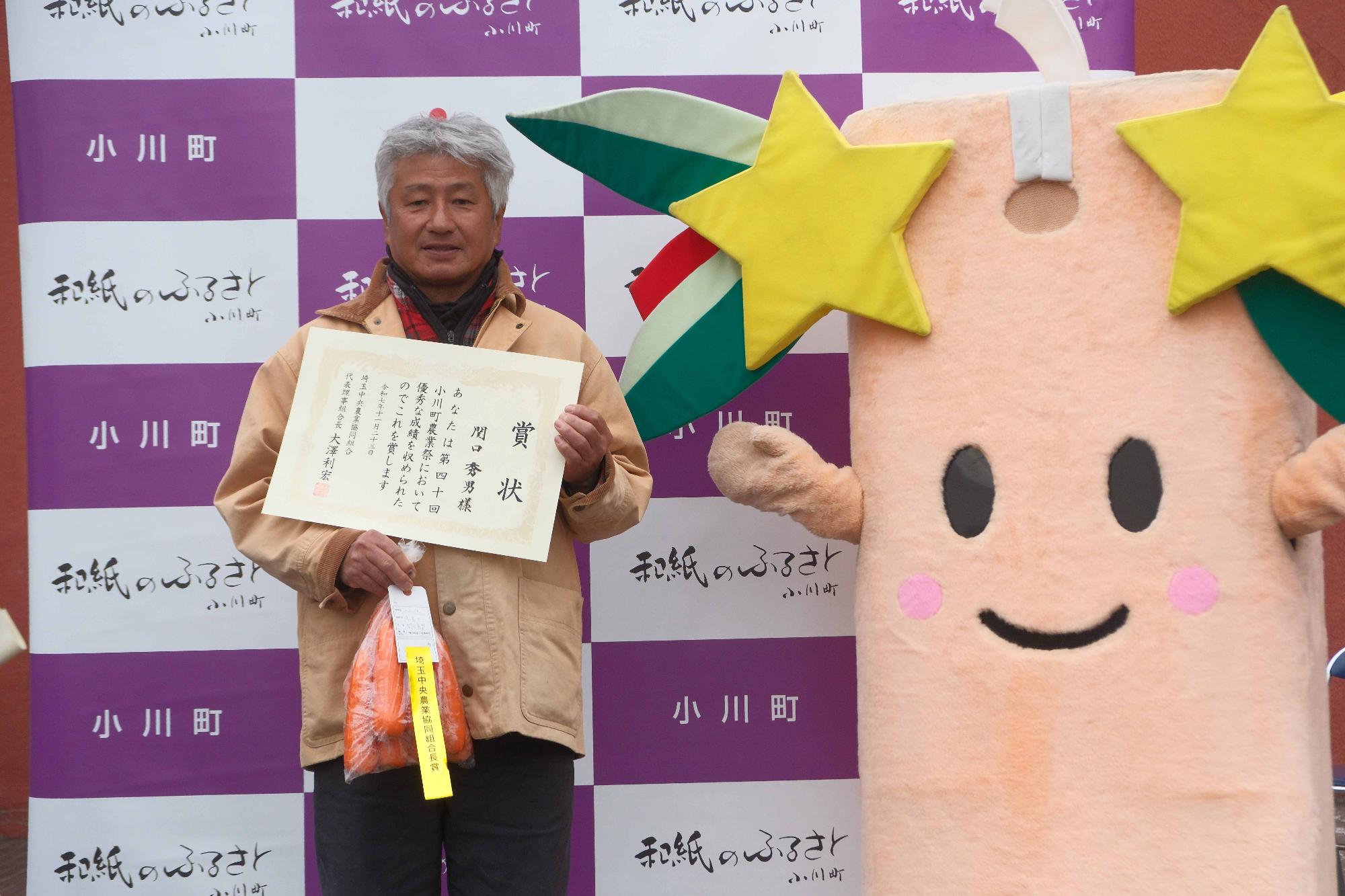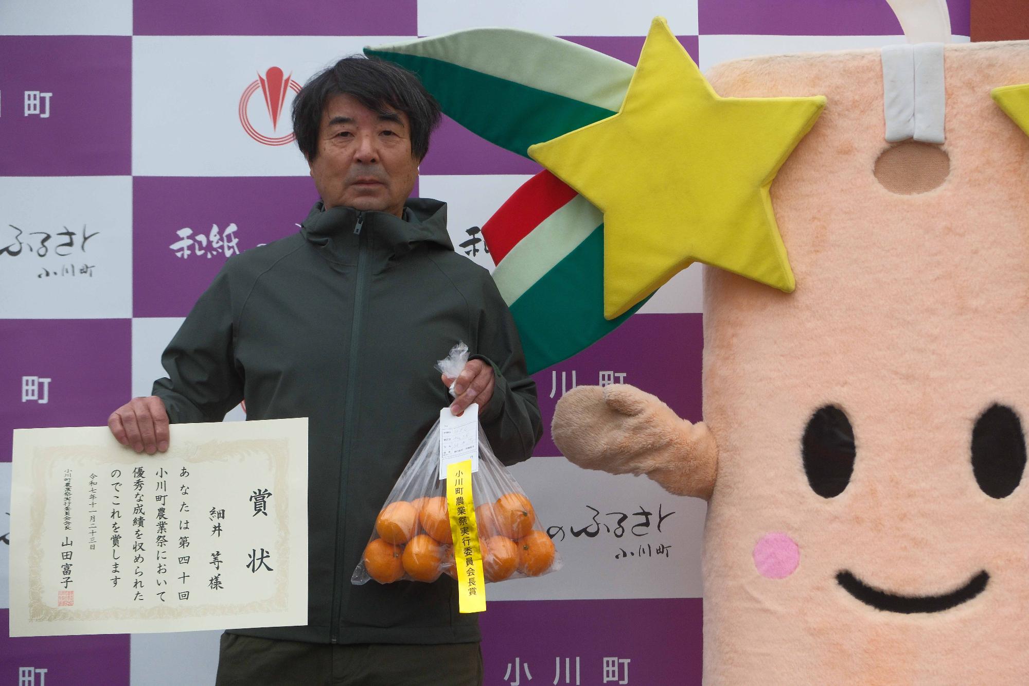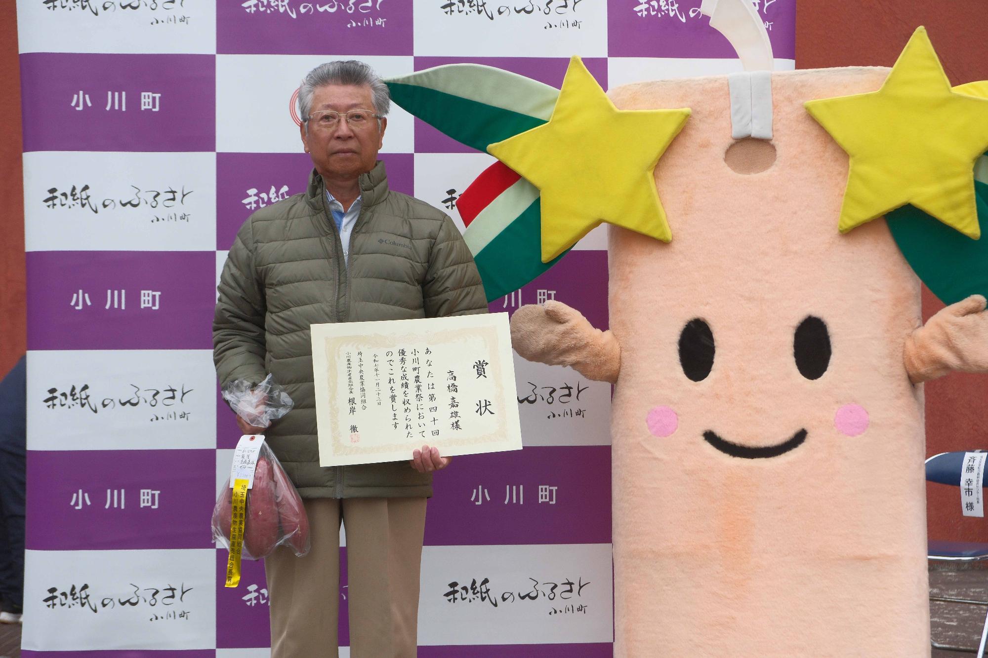 「小川町農業祭審査及び表彰規定」に基づき、22日(土曜日)に実施した品評会に出品された農産物全676点を審査し、特に優秀な農産物を出品した方などを表彰するものです。「埼玉県知事賞」をはじめとする特別賞は、7点が選考されました。また、特別賞のほか、出品された方の中から農業に対して特に貢献されている方を5名選考し、実行委員会より奨励賞が授与されました。表彰式に出席いただいた受賞者を以下のとおりご紹介します。