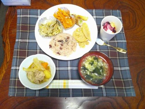今年度初めてのほっこりひろばは夕方の開催でした。二部制で、5時と6時に食事を提供。献立は、赤飯、ネギの肉巻き、人参しりしり、たけのこの煮つけ、肉じゃが、もやしの和え物、磯香汁、デザートはコーンフレークとヨーグルトのブルーベリーソースがけ。